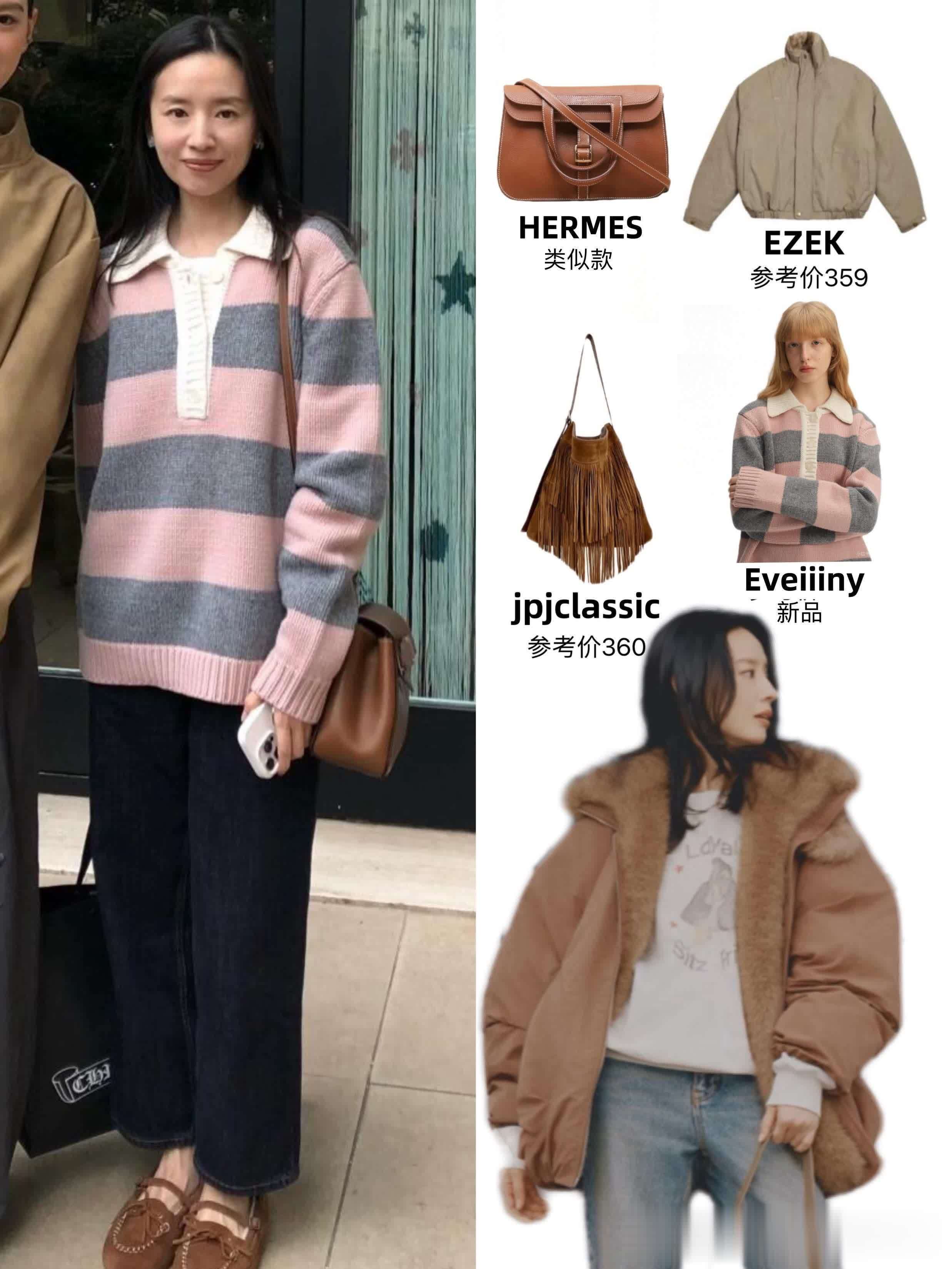 而且她选的单品都很“接地气”,针织衫、牛仔裤、乐福鞋都是日常能买到的基础款,价格也很友好,像那个棕色包包,Hermès类似款太贵,平替的jpjclassic才300多,质感却一点不输,普通人也能轻松get同款。董洁的穿搭从不是靠大牌堆出来的,而是靠“色彩搭配”和“版型选款”取胜,每套都简约却不简单,秋冬不知道穿啥的姐妹,跟着她学准没错,轻松穿出高级感满满的松弛氛围~更绝的是她很会用“小面积亮色”点睛。比如第一套里的粉色条纹,没有大面积铺陈,而是和灰色交替出现,温柔又不会甜腻得发齁;第二套的白色内搭,在棕色外套和蓝色牛仔裤之间,像个小纽带,把深浅色系衔接得特别自然。